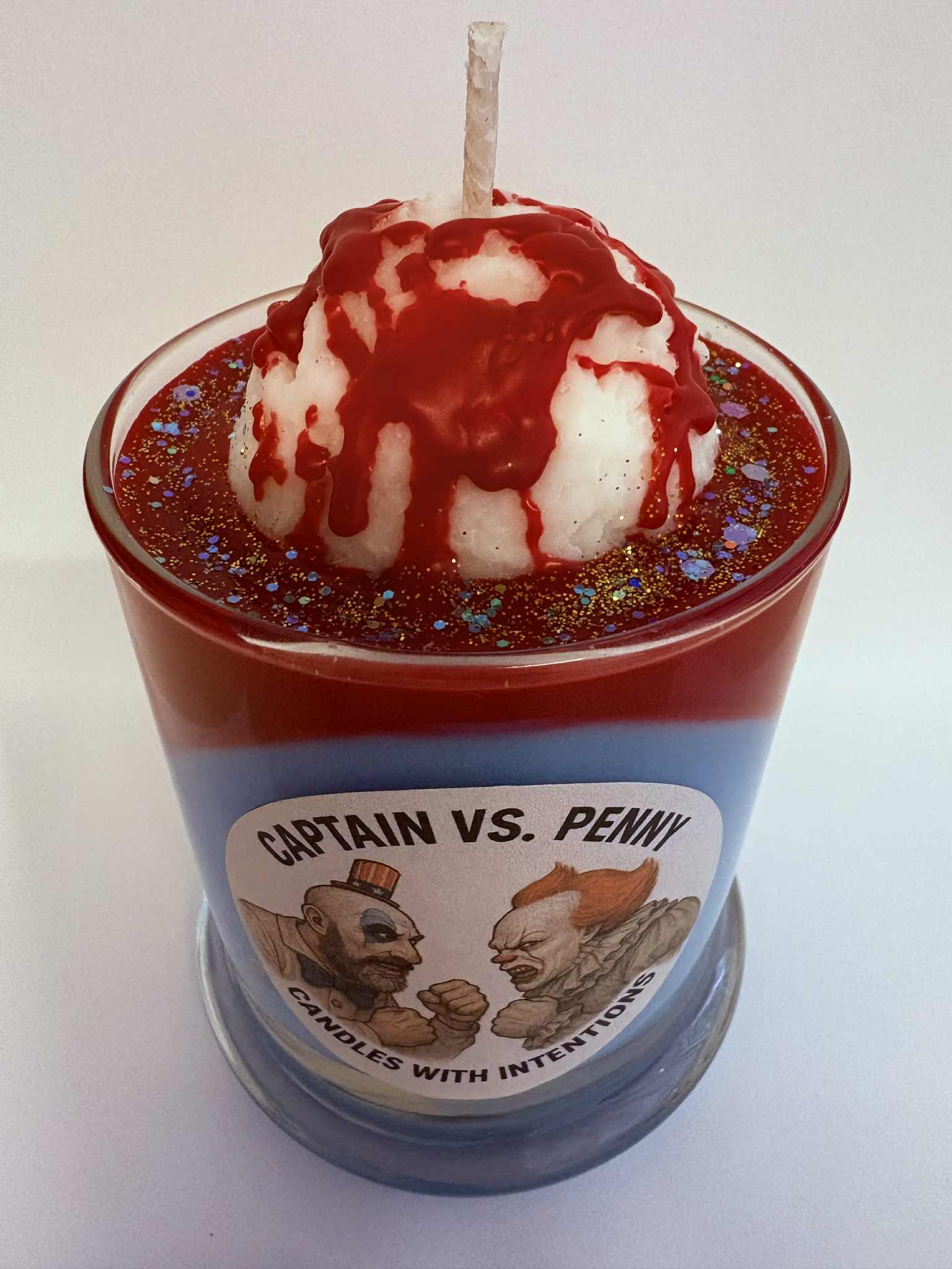 Step right into the ultimate showdown with our Captain vs. Penny Candle—a fierce clash of color, scent, and intention. This 12.5 oz creation layers three bold wax colors—yellow, blue, and red—mirroring the chaotic, twisted carnival energy of two iconic clowns facing off.