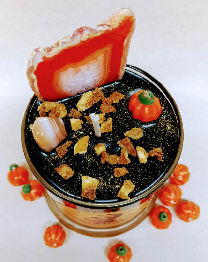 Inspired by the cult classic Trick 'r Treat, this hauntingly beautiful candle is a love letter to Halloween. With black glittered wax, real crystal points, candy corn wax embeds, and a candy pumpkin topper, itâs a spooky-sweet masterpiece.