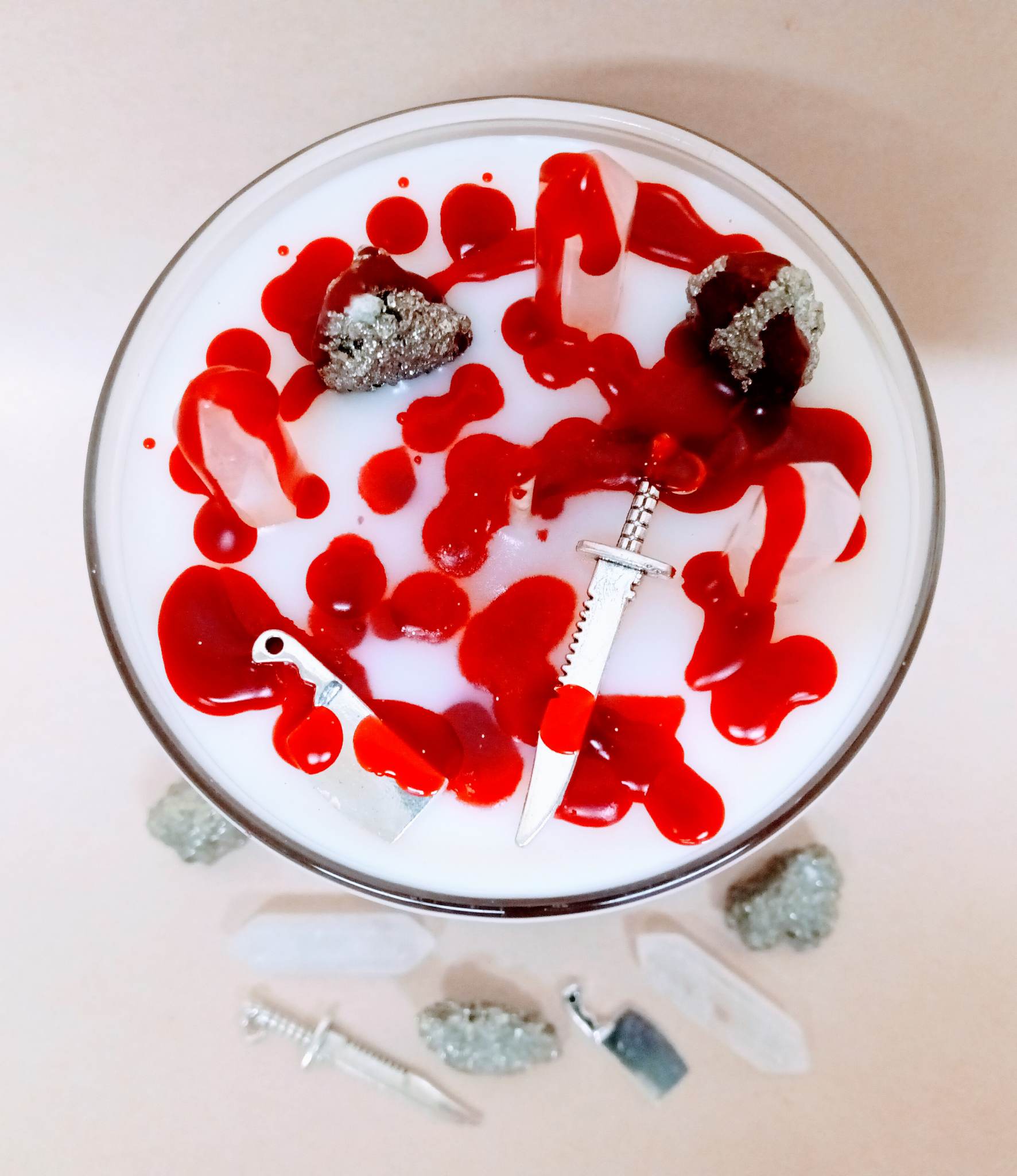 Toppings: Clear quartz, raw pyrite, knife & dagger charms, realistic wax “blood splatter”